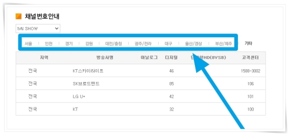 2. 기타 탭에서 KT, SK, LG, 스카이라이프 번호를 확인할 수 있고 지역 방송사는 해당지역을 클릭해 보세요.